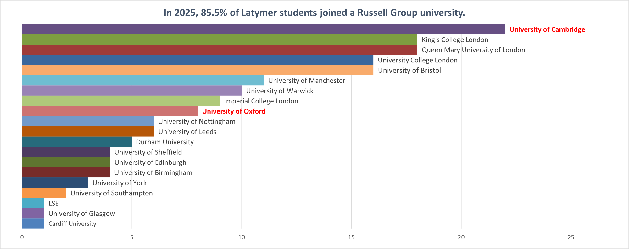 Many students choose to study A Levels at the Latymer School Sixth Form with aspirations of later progressing onto university. Having given students the skills they need to succeed, it is always a pleasure to see the vast majority of students awarded a place at their first choice university. Students go on to study a wide variety of subjects, ranging from traditional courses, such as Law, Architecture or Medicine, to more creative programmes, such as Animation or Television Production.